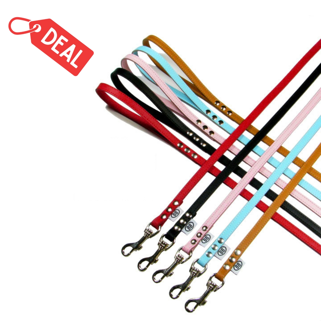 Shop our remaining stock of smooth leather leashes, available in our Permanent Collection colours: Red, Black, Caramel, Blue, Pink, and Hot Pink.